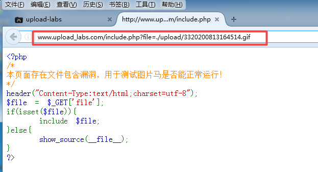 虽然上传后的文件类型时一个gif格式的图片文件,但是通过文件包含漏洞修改上传的文件的文件头可以欺骗从而绕过服务器后台的检测,运行图片马的恶意代码,PHP代码中的会使用GET方式获取file中的参数,我们需要在URL链接中添加GIF文件的路径,当前的include.php文件就会包含图片马中的php一句话代码。