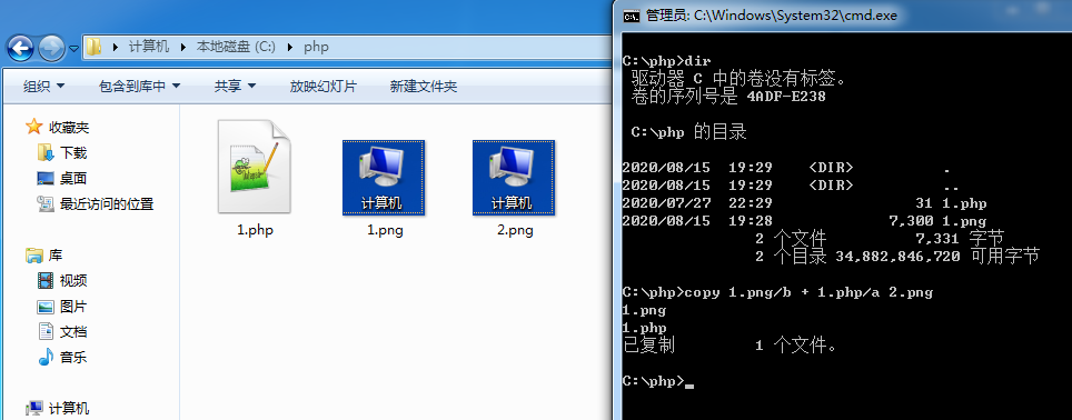 先准备一句话木马文件1.php和一张png图片1.png,然后使用copy命令制作2.png图片马文件,如下图所示: