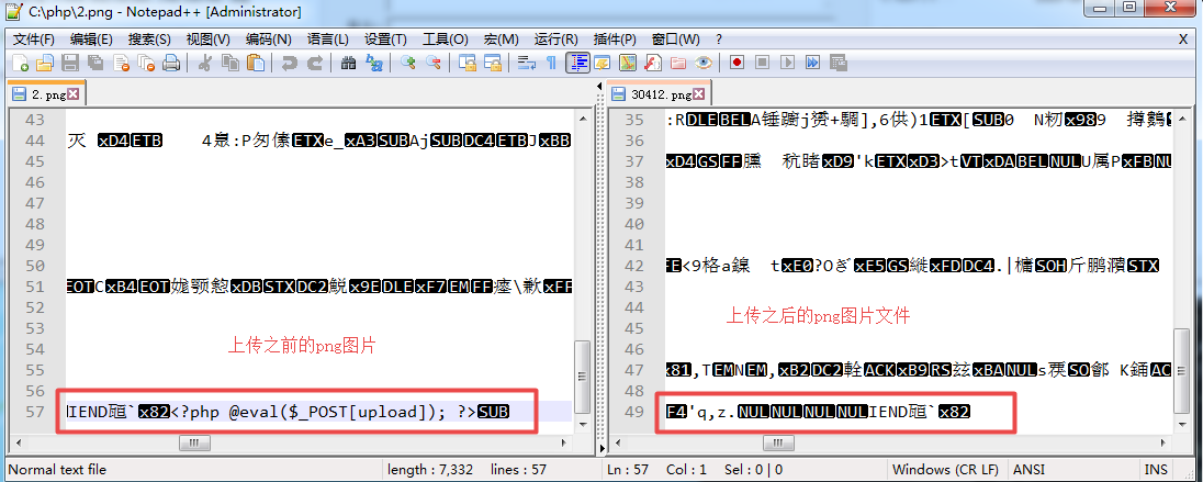 将一个正常显示的图片上传到服务器,寻找图片被渲染后与原始图片部分对比仍然相同的数据块部分,将一句话木马插入到这一部分,然后上传图片马文件。