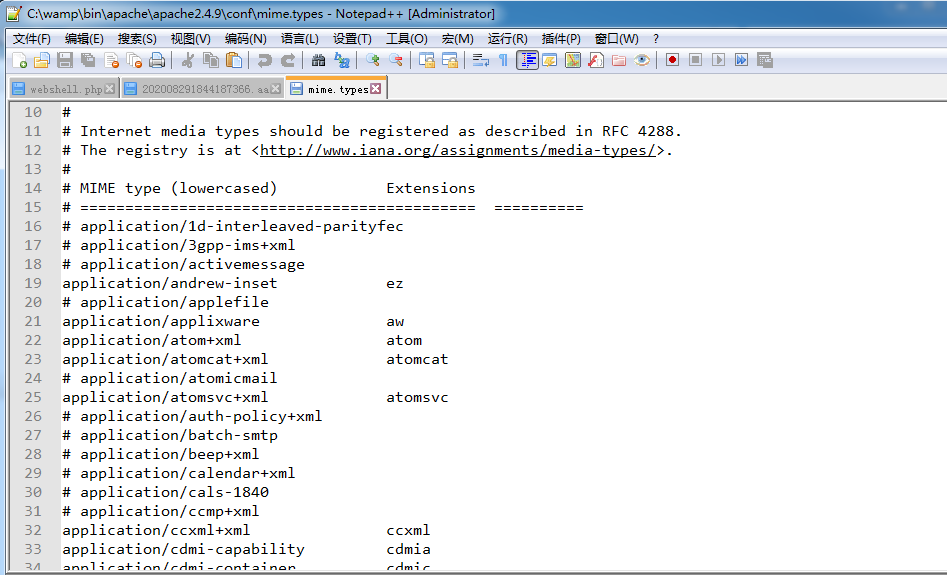 在apacha的安装目录下/conf/mime.types文件中有详细的扩展名列表,如下所示: