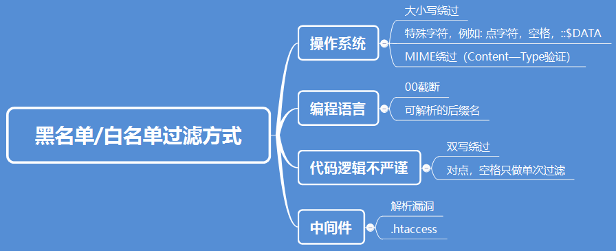 因此黑名单过滤方式是一种不安全的方式,隐藏了太多未知的风险,无法防御上传漏洞。