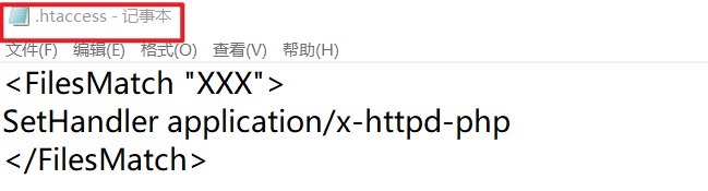 .htaccess文件用处:通过 .htaccess文件调用php解析器取解析一个文件名中包含 “XXX” 字符串(自定义字符串)的任意文件,无论你的文件名是什么样子,只要包含定义的字符串(“XXX”),的都可以被以php的方式解析。
