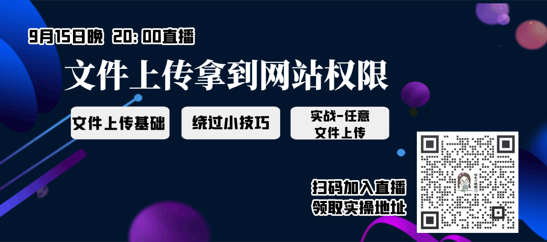 当然文件上传漏洞与防御远不止上面列举的这些,如果大家想了解更多的文件上传的知识,今晚(9月15日晚上20:00)我们zoneBAI老师将在直播间手把手带大家学习实操,zoneBAI老师还会分享我们平时学习不到的小技巧哟,都是他多年的经验总结,快扫码预约直播吧!