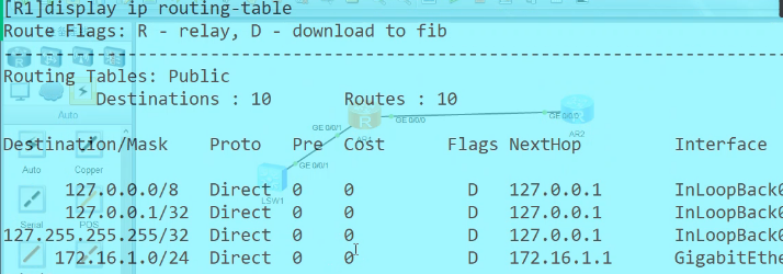 直连路由:PRE0-255,由低到高,FLAG表示路由类型。