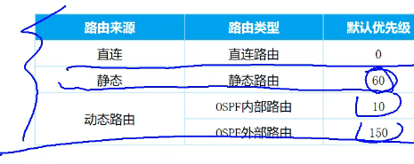 常见路由优先级:内部路由宣告出来的,外部路由是引入的