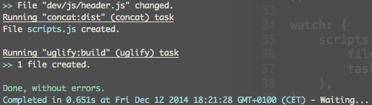 现在我们有两个选择。 每当您要串联和缩小脚本时,都可以切换到终端并键入grunt 。 您还可以使用watch命令启动文件grunt watch : grunt watch 。