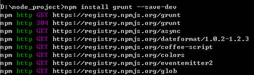 进入到某项目根目录,我在d盘新建了node_project文件,使用命令: npm install grunt --save-dev