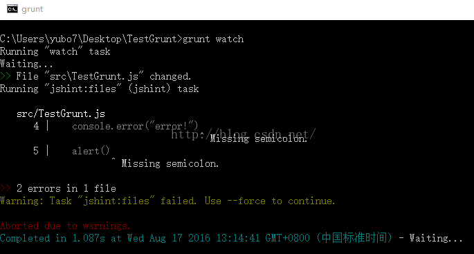 这里我们可以发现,命令行中提示了TestGrunt.js文件中的两处错误,这就表明Grunt插件watch和jshint正常运行了,因为我们修改了TestGrunt.js文件,所以插件watch的任务被执行,而在上面的Gruntfile中我们配置的是,文件改变后就执行jshint任务,所以在命令行下才会出现错误提示。这里需要注意的是,修改了TestGrunt.js文件后,只有保存文文件后watch才能监控到文件的改变。