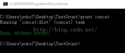 }OK了,下面就可以测试Grunt的插件是否运行正常了,我们在命令行下进入TestGrunt目录,然后执行grunt concat命令,如下图所示: