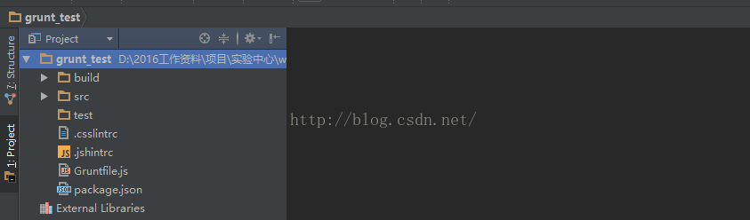 在webstom中或者直接在硬盘目录下新建一个工程grunt_test,根目录下新建文件夹build、src、test及文件Gruntfiles.js及package.json,如下: