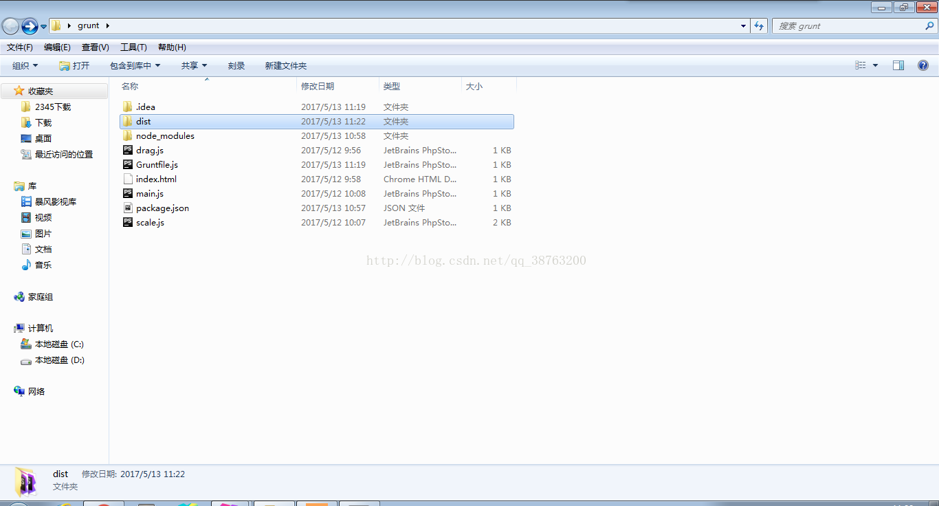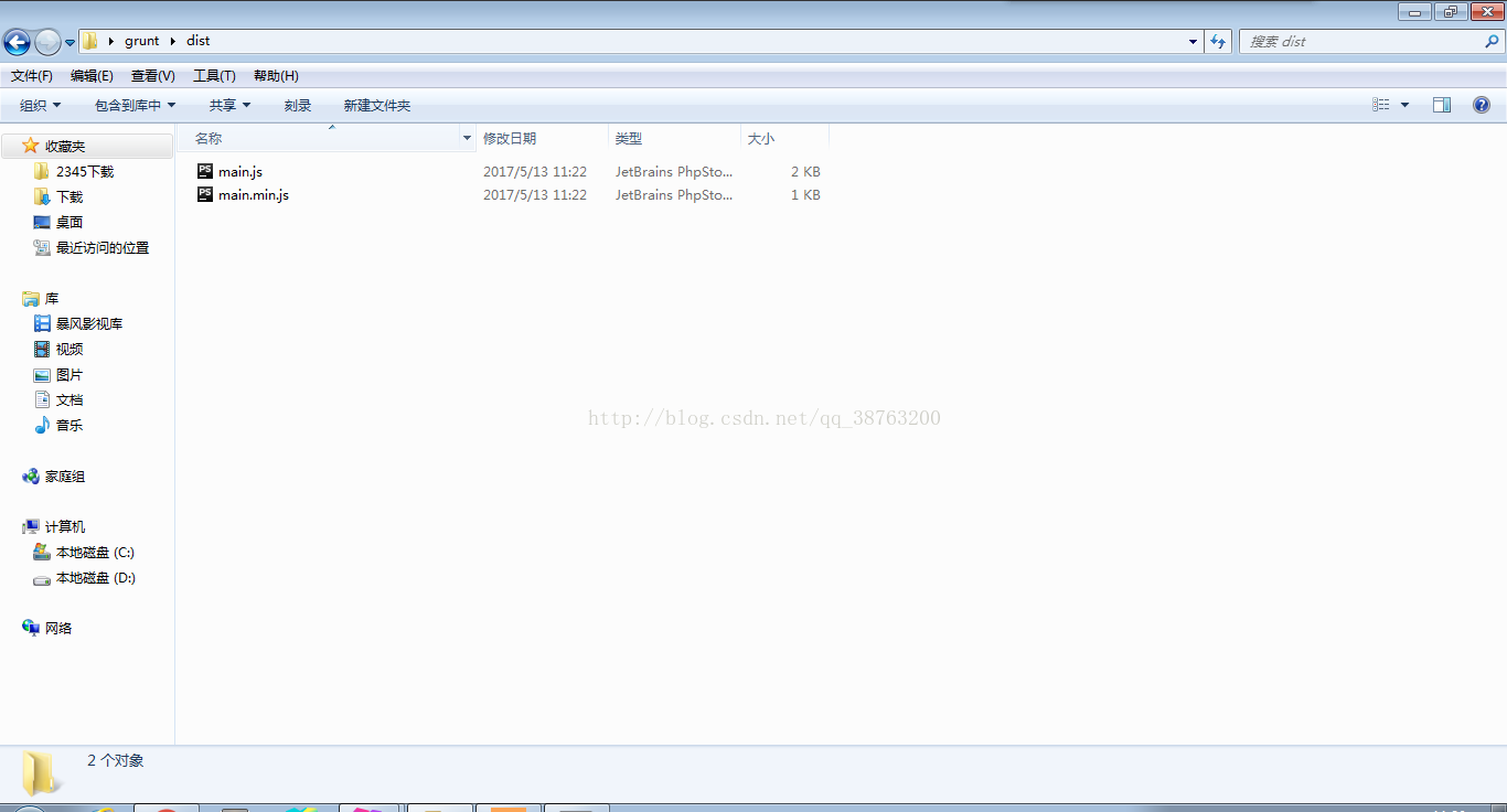 第五步, 在项目目录下 运行grunt构建在命令栏里输入grunt回车即可,出现的结果如下。返回项目目录,你会找到新文件夹dist,里面有合并成功的main.js和压缩成功的main.min.js两个文件。![]()
