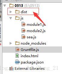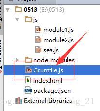 3) 下载安装成功后会在项目文件夹里有一个名为 node-modules的文件夹。然后继续新建Gruntfile.js文件 如图: