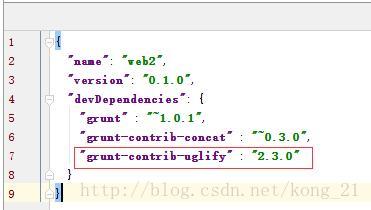 首先在package.json文件中添加 "grunt-contrib-uglify" : "2.3.0" 如图: