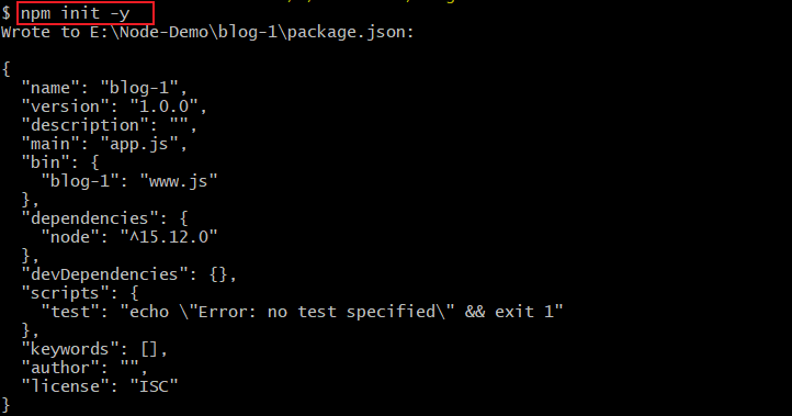 4、输入npm init -y命令,它就会自动创建一个package.json文件,如下: