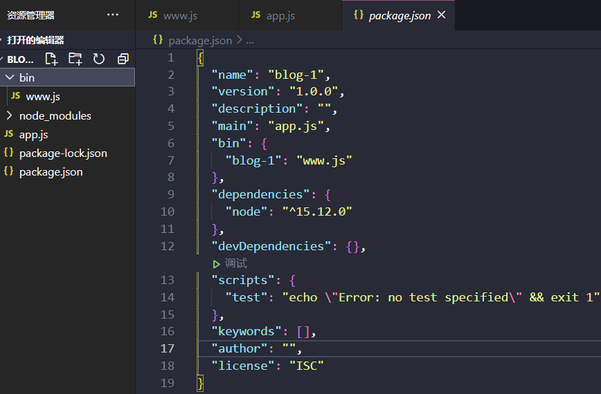 2、在项目新建bin文件夹,在bin中新建www.js,并写入以下代码: