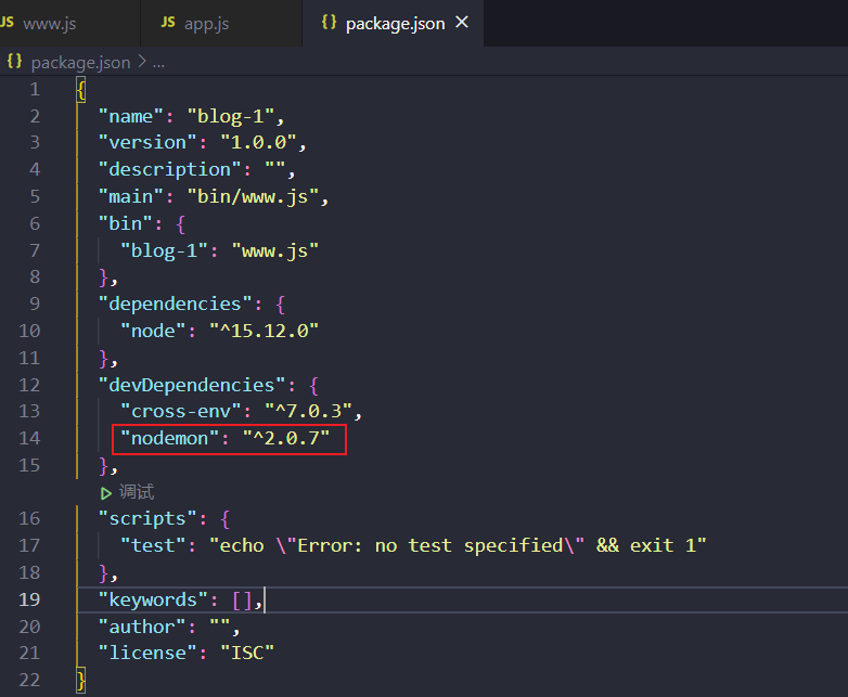 5、安装nodemon(输入npm install --save-dev nodemon是安装到项目里(输入npm i -g nodemon 或 npm install -global nodemon是进行全局安装,使用nodemon -v检查是否全局安装成功),package.json的devDependencies会自动出现版本号)