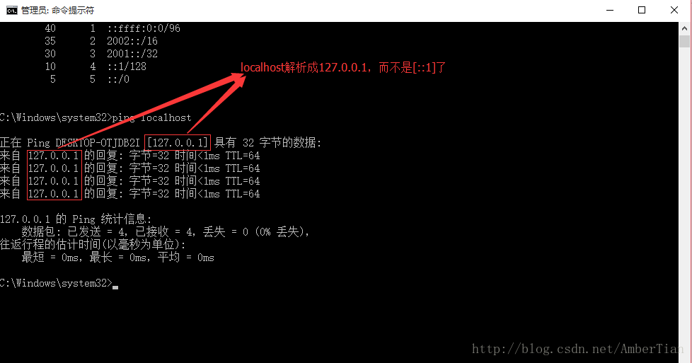 可以看到,此时:: / 96,:: ffff:0:0/96优先级高于::/0了。ping一下localhost,