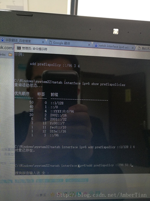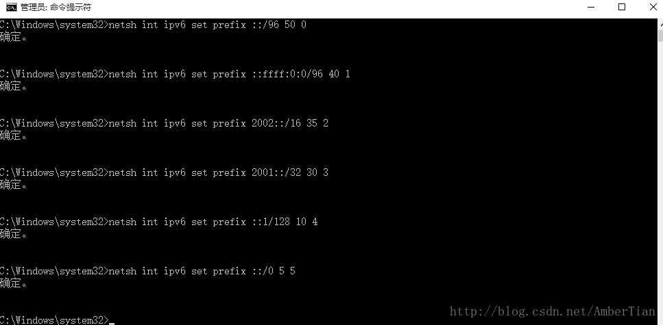 现在需要设置使::/96、::ffff:0:0/96的优先级高于::/0和::1/128,在命令行中依次设置优先级: