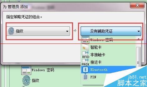 3、弹出“指定策略凭证的组合”窗口,在两个菜单中分别下拉选择“指纹”和“Bluetooth”点击“确定”