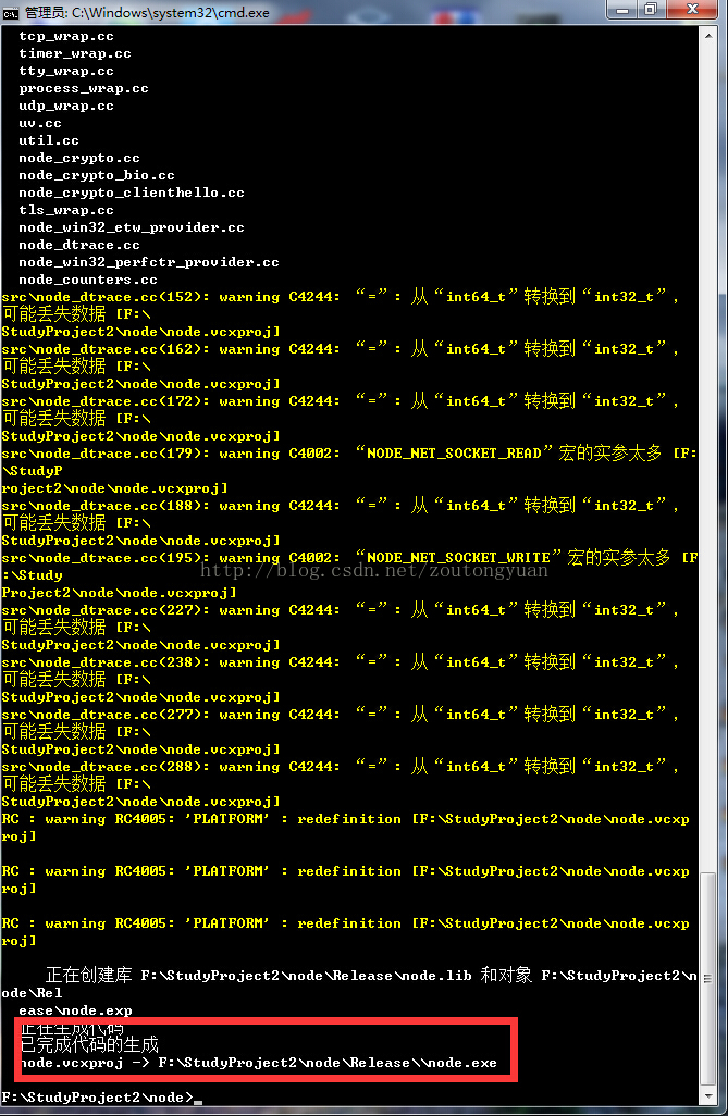 大概 10多分钟 就可以编译成功,在Release目录下会生成node.exe。下面是我编译成功的图。