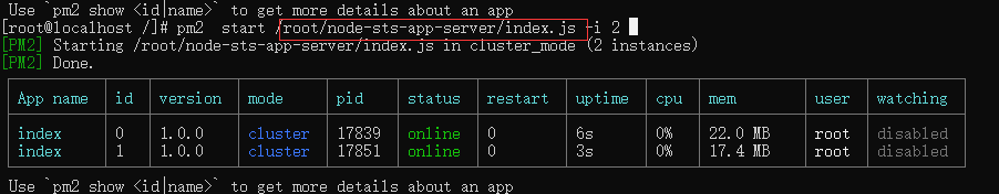 使用pm2启动node(命令中的2代表启动两个app,这个启动数目跟系统内核数相关)