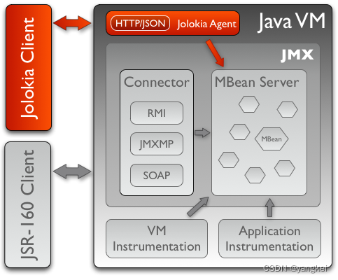 Jolokia 是一个用来访问远程 JMX MBeans 的崭新方法,与 JSR-160 连接器不同的是,它使用基于 HTTP 的 JSON 格式作为通讯协议,提供 JMX 批量操作等。