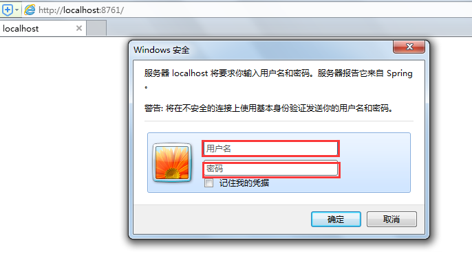 测试:再次访问http://localhost:8761/,弹出如下认证页面,输入正确认证信息即可。