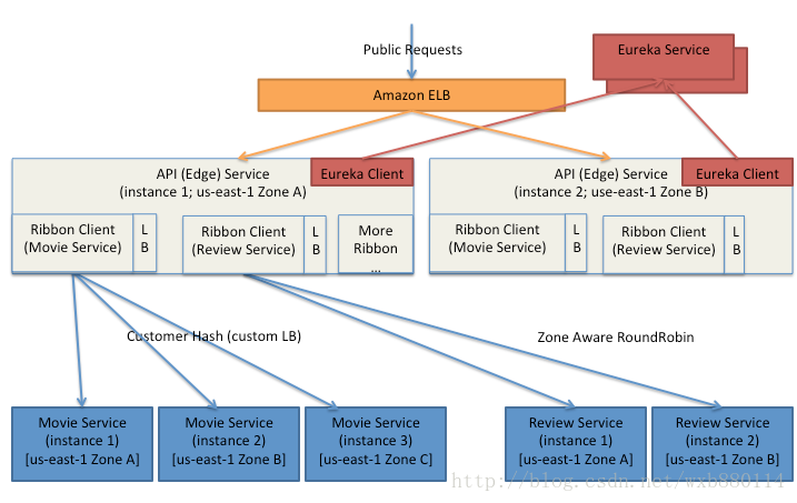 一个RESTful服务,用来定位运行在AWS地区(Region)中的中间层服务。由两个组件组成:Eureka服务器和Eureka客户端。Eureka服务器用作服务注册服务器。Eureka客户端是一个java客户端,用来简化与服务器的交互、作为轮询负载均衡器,并提供服务的故障切换支持。Netflix在其生产环境中使用的是另外的客户端,它提供基于流量、资源利用率以及出错状态的加权负载均衡。