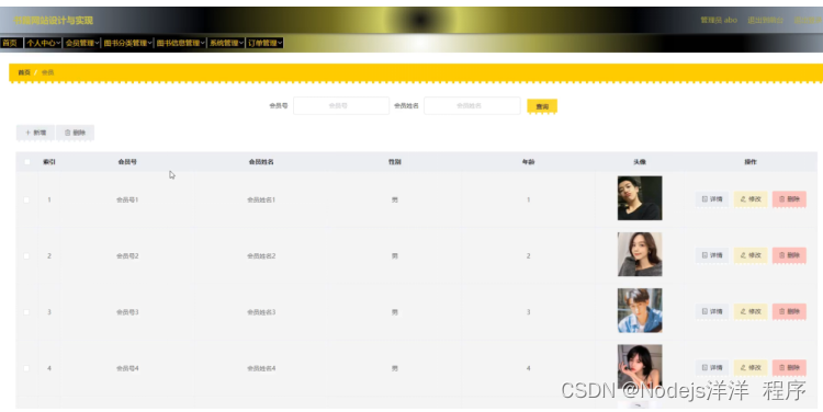 会员管理,在会员管理页面中可以查看索引、会员号、会员姓名、性别、年龄、头像等内容,并进行详情,修改或删除等操作,如图5-8所示。