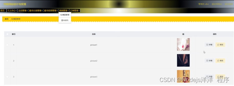 系统管理,在轮播图管理页面中可以查看索引、名称、值等内容,并进行详情或修改等操作,还可对图书资讯进行详细操作,如图5-11所示。