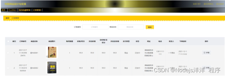 订单管理,在已支付订单页面中可以查看索引、订单编号、商品名称、商品图片、购买数量、价格/积分、折扣价格、总价格/总积分、折扣总价格、支付类型、状态、地址、电话、收货人、下单时间等内容,并进行详情操作,还可对已完成订单、已发货订单、未支付订单、已取消订单、已退款订单进行相应操作,如图5-16所示。