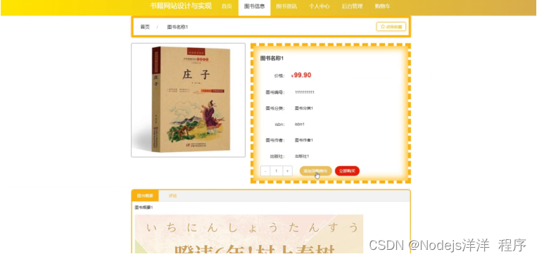 图书信息,在图书信息页面中可以查看图书名称、图书封面、价格、图书编号、图书分类、isbn、图书作者、出版社、图书概要等内容,根据需要进行添加到购物车、立即购买操作,如图5-2所示。