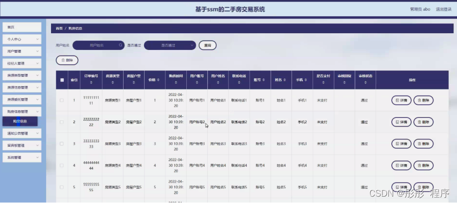 购房信息管理,管理员可在购房信息管理页面查看订单编号、房源类型、房屋户型、价格、购房时间、用户账号、用户姓名、联系电话、账号、姓名、手机、是否支付、审核回复、审核状态等内容,还可进行删除等操作,如图5-15所示。