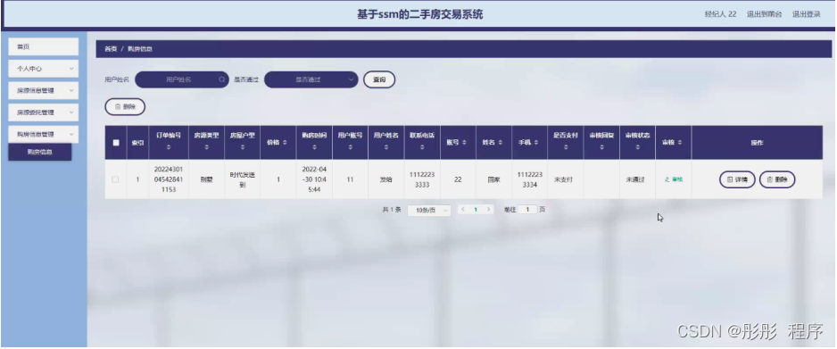 购房信息管理,经纪人可在购房信息管理页面查看订单编号、房源类型、房屋户型、