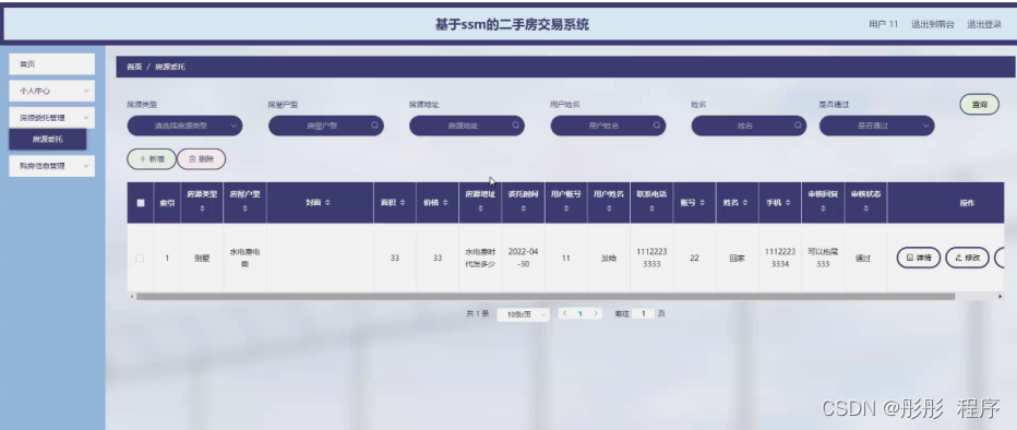 房源委托管理,用户可在房源委托管理页面查看房源类型、房屋户型、封面、面积、价格、房源地址、委托时间、用户账号、用户姓名、联系电话、账号、姓名、手机、审核回复、审核状态等内容,还可进行新增、修改或删除等操作,如图5-7所示。