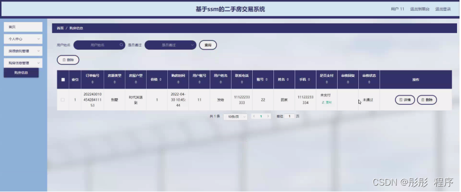 购房信息管理,用户可在购房信息管理页面查看订单编号、房源类型、房屋户型、价格、购房时间、用户账号、用户姓名、联系电话、账号、姓名、手机、是否支付、审核回复、审核状态等内容,还可进行删除等操作,如图5-8所示。