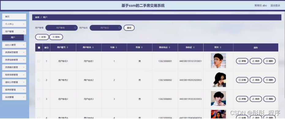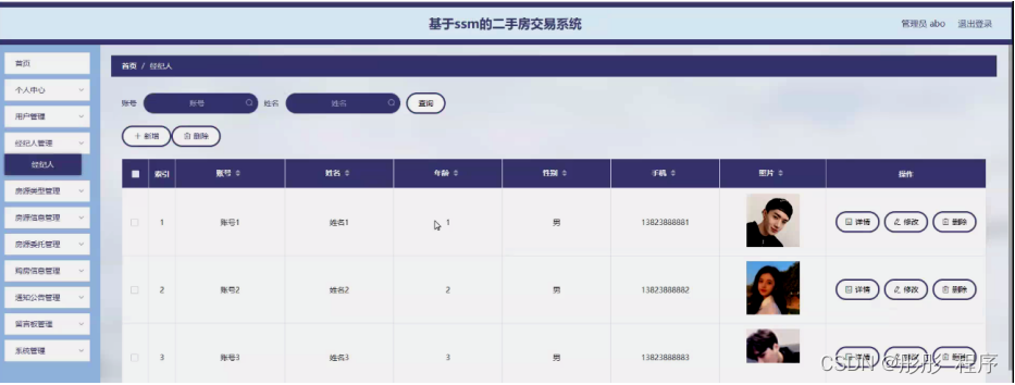 经纪人管理,管理员可在经纪人管理页面查看账号、姓名、年龄、性别、手机、照片等内容,还可进行新增、修改或删除等操作,如图5-12所示。