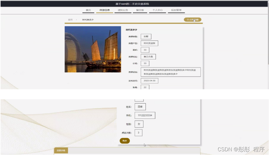 房源信息,用户可在房源信息页面查看房源名称、房源类型、房屋户型、面积、房源地址、价格、房源设施、发布时间、账号、姓名、手机、封面、性别、点击次数等内容,还可进行收藏或购房等操作,如图5-5所示。