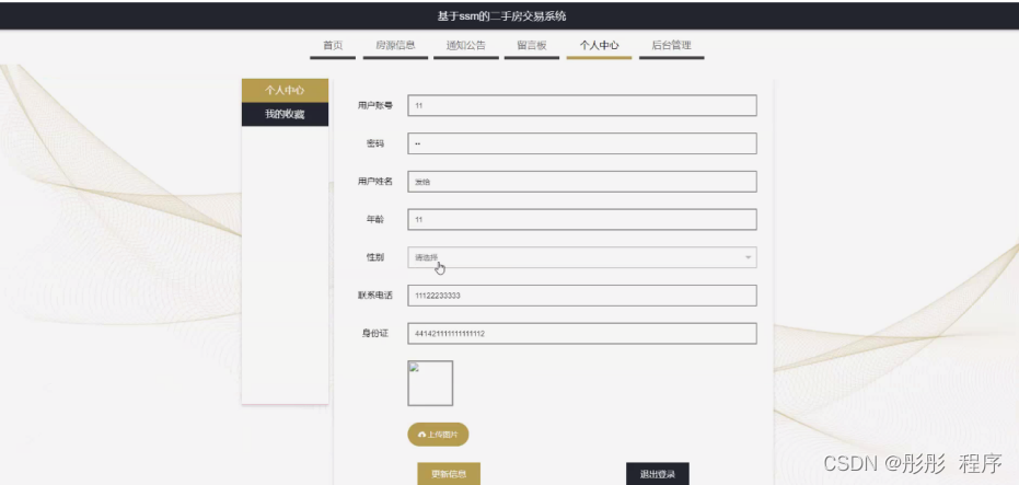 个人中心,用户可在个人中心页面通过输入用户账号、密码、用户姓名、年龄、性别、联系电话、身份证、上传图片等内容进行更新信息或查看我的收藏等内容,如图5-3所示。
