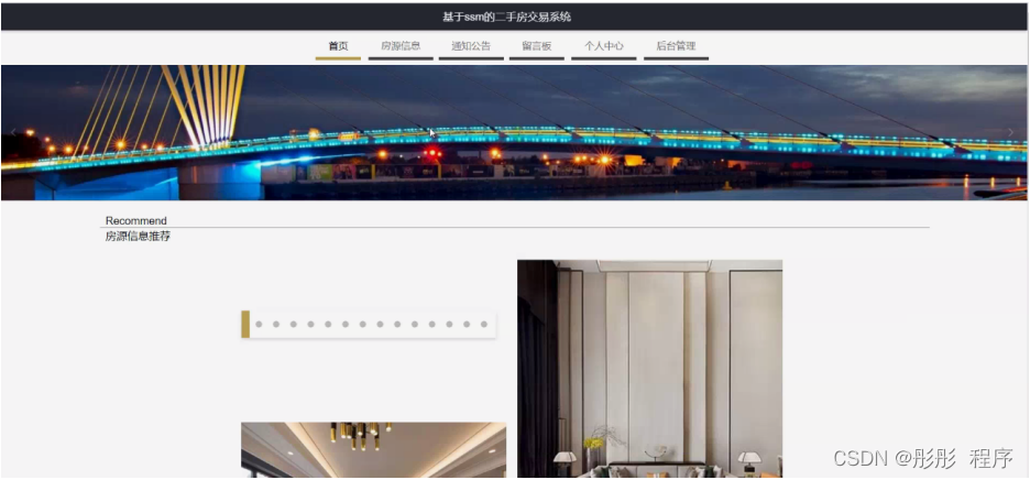 二手房交易系统,在系统首页可查看首页、房源信息、通知公告、留言板、个人中心、后台管理等内容,如图5-1所示。