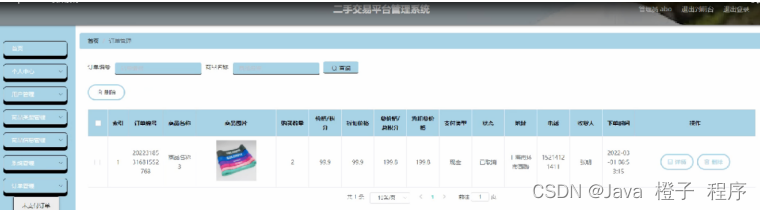 订单管理,在订单管理页面可以对索引,订单编号,商品名称,商品图片,购买数量,价格,折扣价格,总价格,折扣总价格,支付类型,状态,地址,电话,收货人,下单时间等内容进详情和删除操作,如图5-10所示。