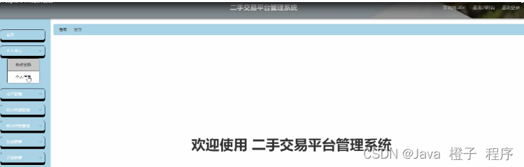 二手交易平台管理系统,在系统首页可以查看首页,商品信息,商品资讯,个人中心,后台管理,购物车等内容,并进行详细操作;如图5-1所示。