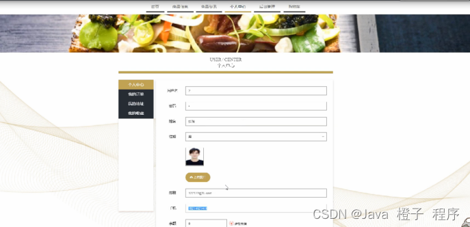 个人中心,在个人中心页面通过填写用户名,密码,姓名,性别,邮箱,手机等内容进行更新信息,对余额进行点我充值操作,还可以根据需要对我的订单,我的地址,我的收藏进行相对应操作,如图5-4所示。