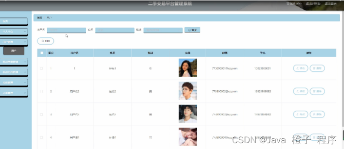 用户管理,在用户管理页面可以对索引,用户名,姓名,性别,头像,邮箱,手机等内容进行修改和删除操作,如图5-7所示。