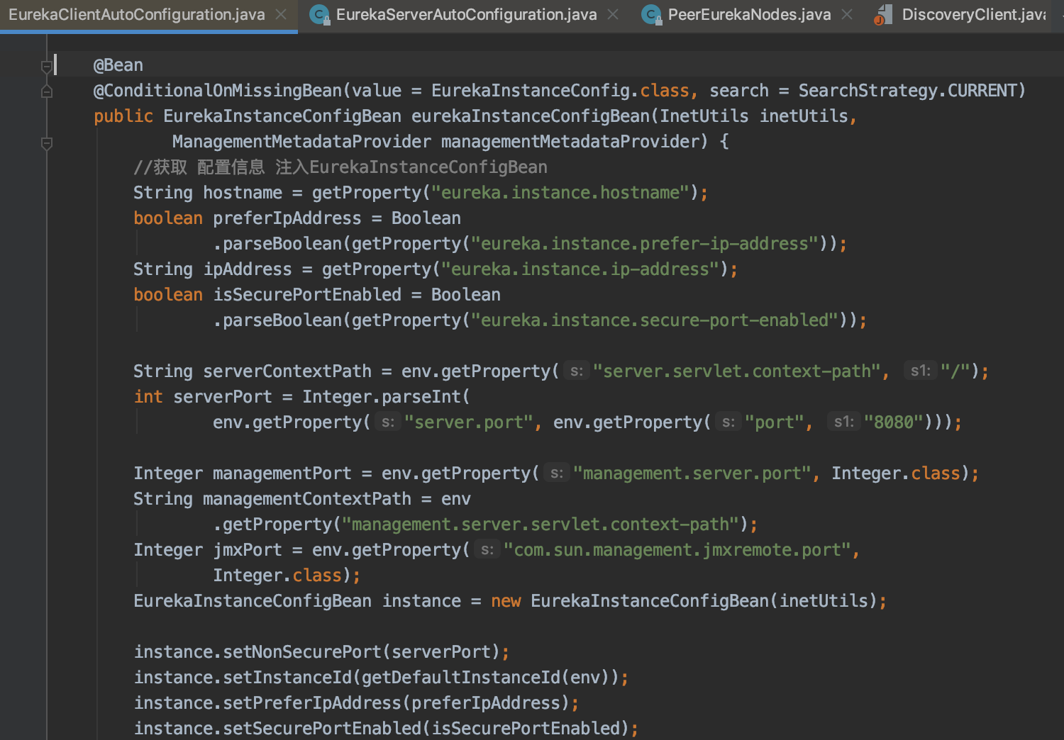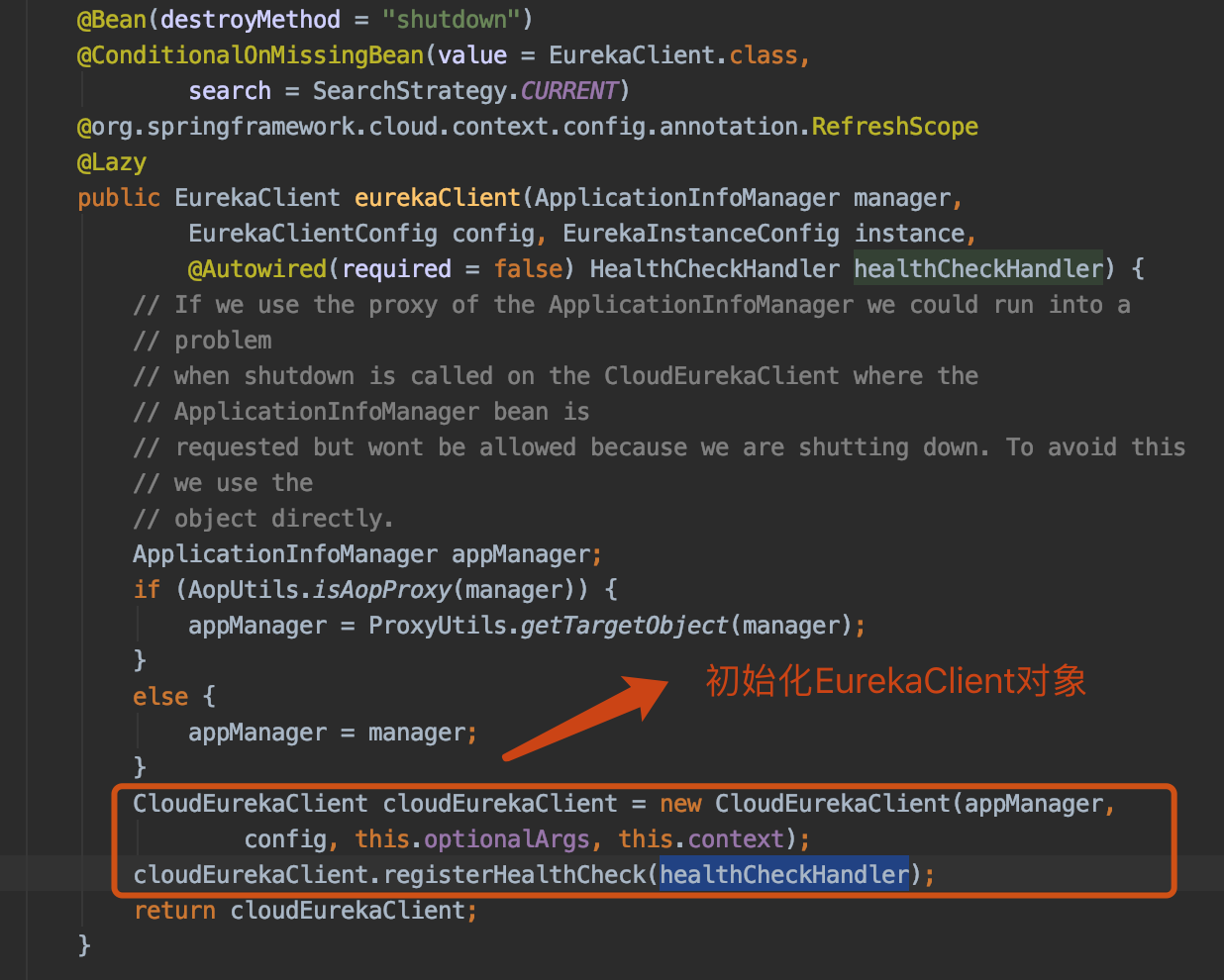 EurekaClientAutoConfiguration类:该类初始化EurekaInstanceConfigBean(配置信息类) ,DiscoveryClient(cloud对DiscoveryClient的包装实现类CloudEurekaClient)