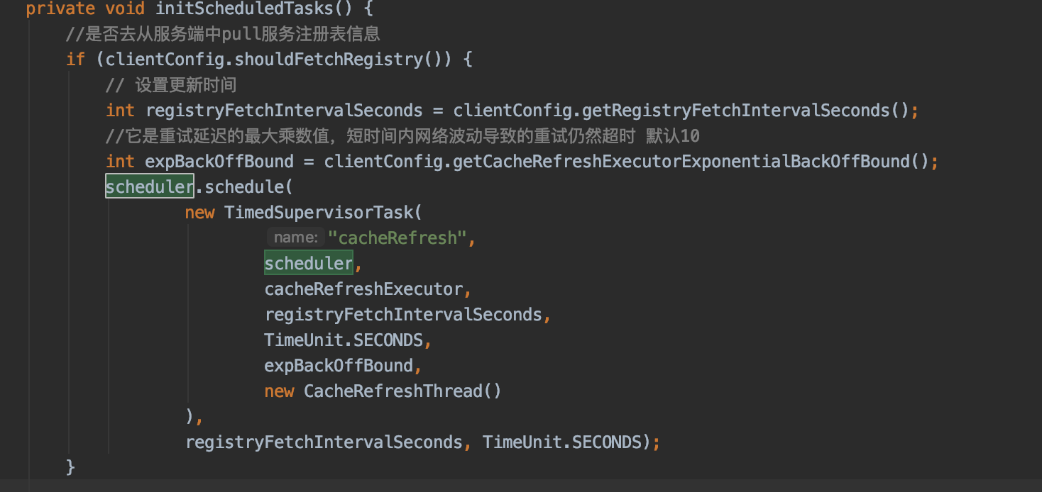 - 客户端缓存: 客户端缓存主要分为两块内容,⼀块是 Eureka Client 缓存,⼀块是 Ribbon 缓存。 Eureka Client 缓存:EurekaClient负责跟EurekaServer进⾏交互,在EurekaClient中的com.netflflix.discovery.DiscoveryClient.initScheduledTasks() ⽅法中,初始化了⼀个 CacheRefreshThread 定时任务专⻔⽤来拉取 Eureka Server 的实例信息到本地。所以我们需要缩短这个定时拉取服务信息的时间间隔(eureka.client.registryFetchIntervalSeconds) 来快速发现新的服务。 Ribbon 缓存 Ribbon会EurekaClient中获取服务信息,ServerListUpdater是Ribbon中负责服务实例 更新的组件,默认的实现是PollingServerListUpdater,通过线程定时去更新实例信息。定时刷新的时间间隔默认是30秒,当服务停⽌或者上线后,这边最快也需要30秒才能将实例信息更新成最新的。我们 可以将这个时间调短⼀点,⽐如 3 秒。 刷新间隔的参数是通过 getRefreshIntervalMs ⽅法来获取的,⽅法中的逻辑也是从Ribbon 的配置中进 ⾏取值的。 将这些服务端缓存和客户端缓存的时间全部缩短后,跟默认的配置时间相⽐,快了很多。我们通过调整 参数的⽅式来尽量加快服务发现的速度,但是还是不能完全解决报错的问题,间隔时间设置为3秒,也还是会有间隔。所以我们⼀般都会开启重试功能,当路由的服务出现问题时,可以重试到另⼀个服务来 保证这次请求的成功。