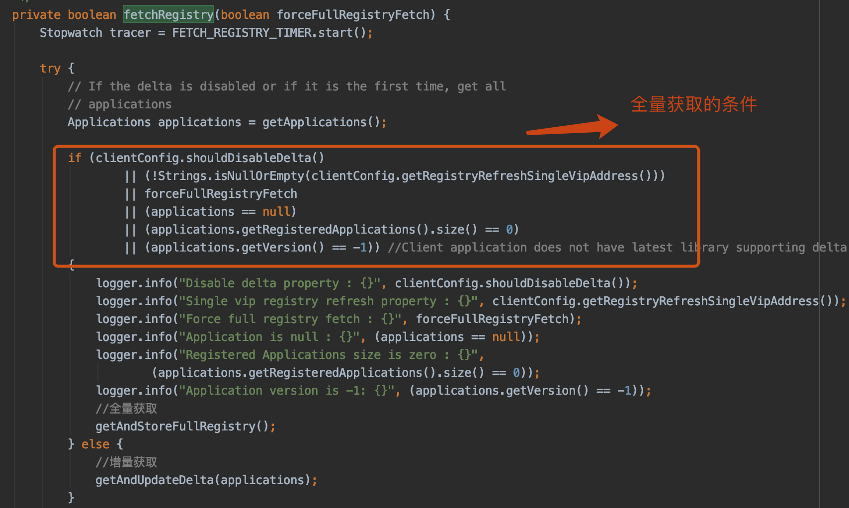 往下追踪下去发现与第一次pull公用一个fetchRegistry方法:根据条件来判断是否全量pull拉取