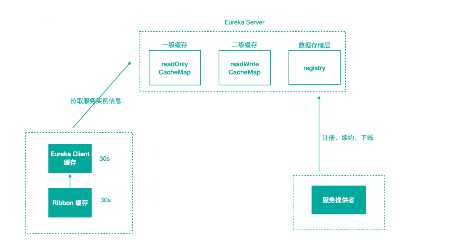 - 服务端缓存 :服务注册到注册中⼼后,服务实例信息是存储在注册表中的,也就是内存中。但Eureka为了提⾼响应速 度,在内部做了优化,加⼊了两层的缓存结构,将Client需要的实例信息,直接缓存起来,获取的时候直接从缓存中拿数据然后响应给 Client。 第⼀层缓存是readOnlyCacheMap,readOnlyCacheMap是采⽤ConcurrentHashMap来存储数据的,主要负责定时与readWriteCacheMap进⾏数据同步,默认同步时间为 30 秒⼀次。 第⼆层缓存是readWriteCacheMap,readWriteCacheMap采⽤Guava来实现缓存。缓存过期时间默认为180秒,当服务下线、过期、注册、状态变更等操作都会清除此缓存中的数据。 Client获取服务实例数据时,会先从⼀级缓存中获取,如果⼀级缓存中不存在,再从⼆级缓存中获取, 如果⼆级缓存也不存在,会触发缓存的加载,从存储层拉取数据到缓存中,然后再返回给 Client。Eureka 之所以设计⼆级缓存机制,也是为了提⾼ Eureka Server 的响应速度,缺点是缓存会导致 Client 获取不到最新的服务实例信息,然后导致⽆法快速发现新的服务和已下线的服务。 了解了服务端的实现后,想要解决这个问题就变得很简单了,我们可以缩短只读缓存的更新时间 (eureka.server.response-cache-update-interval-ms)让服务发现变得更加及时,或者直接将只读缓 存关闭(eureka.server.use-read-only-response-cache=false),多级缓存也导致C层⾯(数据⼀致 性)很薄弱。 Eureka Server 中会有定时任务去检测失效的服务,将服务实例信息从注册表中移除,也可以将这个失 效检测的时间缩短,这样服务下线后就能够及时从注册表中清除。