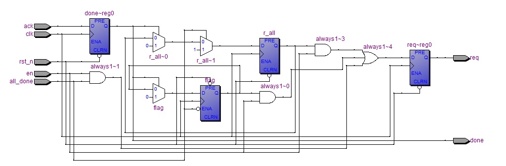 难点在于第一次发送时仅仅须要en有效就可以。而下一次发送必须en和all_done同一时候有效,或者all_done已经有效过。en有效则发送req. done信号则直接与ack同步或者延时一个时钟周期就可以。