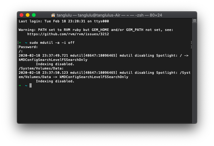 2. 在打开的Terminal软件中输入sudo mdutil -a -i off 点击回车,此时会提示输入密码,密码为用户系统的登录密码,输入密码的时候用户看不到屏幕上的任何变动,输入完登录密码后点击回车,效果如图: